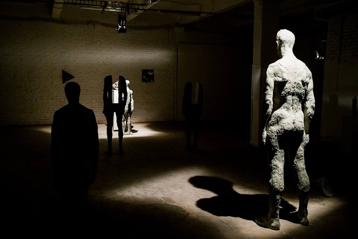 Первое, что встречает на входе в зал с инсталляцией – это звук. Слитый гул, будто звуки подземных пустот или монотонная работа машин. В сумраке стоят человеческие фигуры, обращенные к чему-то, все повернуты к пьедесталу, на котором виднеется железная структура. Вы вступаете в поле скульптур, как в святилище, идете дальше и, оборачиваясь, испытываете смятение, потому что у них срезаны лица. Потому что передняя часть скульптур деформирована геометрически ровно. Из некоторых фигур изъята половина тела, как за ненадобностью - голова и грудная клетка, оставлены только рабочие руки и ноги - то что дает движение, то что дает возможность совершать ритуалы, поддерживать циркуляцию жизни (или какой-то системы?). Одна из фигур стоит на коленях – приклоняется или сломлена - поставлена на колени?