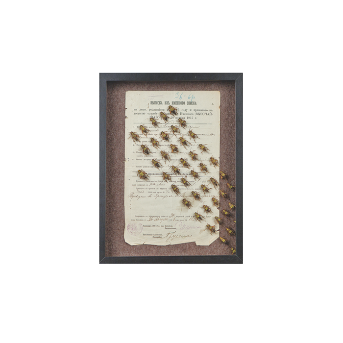 Ассамбляжи, сопровождающие живописные работы Антона Кузнецова, полны военных аллюзий и ассоциаций. Бабочки и стрекозы уподоблены военным германским аэропланам (на их крыльях характерные кельтские кресты), осуществившим "посадку" то на погон солдатской полевой формы, то на планшет с прикрепленным к нему орденом. Одинаковые жуки разнонаправленно ползут по затвердевшей земляной корке, маршируют стройными рядами поверх аутентичной и обезличивающей "Выписки из именного списка" военного подразделения; на спине каждого насекомого — его номер. Эти объекты-реликвии выглядят мощным и существенным аккомпанементом к холстам живописца, который и тут всеми средствами играет на главную смысловую доминанту "Инсектицида".