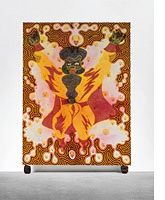 Крис Офили / Chris Ofili «История продолжается… Путешествие из ада» (The Saga Continues...The Journey from Hell), 1997г. Оценочная стоимость £600 000 – 800 000. Художник Крис Офили объединяет в себе несколько идентичностей, сформированных постколониальным и постмодернистским обществом. В творческом процессе он сочетает друг с другом самые различные образы, заимствованные из «традиционной» африканской культуры, религиозной иконографии, поп-культуры (фотографии, кинематографа, телевидения) и музыки (джаза, хип-хопа). В представленном лоте «История продолжается… Путешествие из ада» отчетливо виден авторский декоративный стиль и эклектичные культурные заимствования. Визуально работа выглядит плоской, однако она включает красочные слои, коллажи, и узоры, скрытые под поверхностью каучука. Яркие тона, волнообразные формы и ритмично расположенные пятна наполняют полотно энергетикой. Прозрачные слои каучука и многослойность напоминают об источниках вдохновения, а две подставки из навоза приподнимают картину над полом, трансформируя полотно в художественный объект.