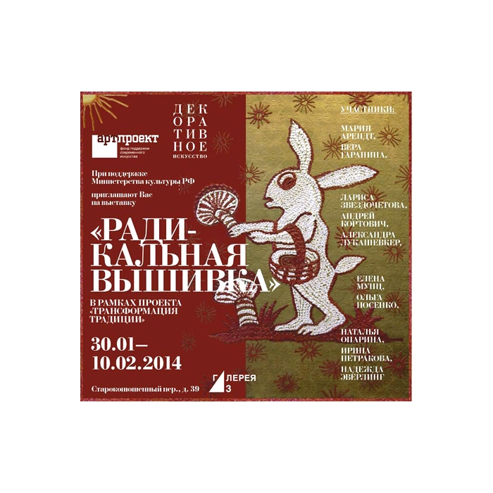 Проект «Радикальная вышивка» посвящен трансформациям, произошедшим за последний век в этом искусстве. В России, как и во многих европейских странах техника вышивки перешла в инструментарий современного искусства. Известному расшитому «Званому ужину» феминистки Джуди Чикаго уже около 40 лет, именно тогда появились первые опыты использования традиционных рукодельных технологий в актуальном искусстве. Вышитые работы можно увидеть в музее искусства и дизайна Нью-Йорка, в программах международных биеннале: на последней биеннале в Венеции куратор Массимилиано Джони включил в основной проект большое количество вышивок.