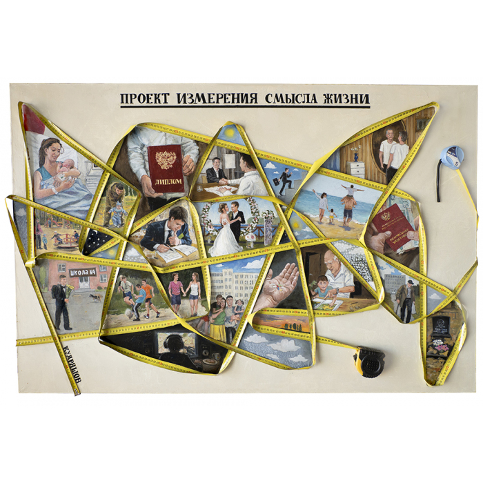 На обложке: «Проект измерения смысла жизни», 100х150, холст, масло, рулетки. Д. Кудряшов