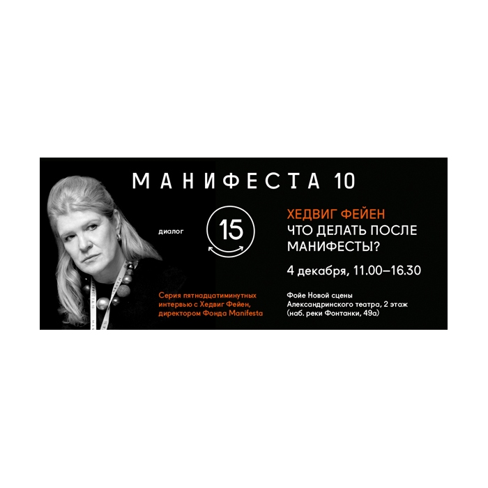 11:00 – 11:15 – Кофе-брейк11:15 – Вступительное слово Хедвиг Фейен (директор Фонда Manifesta)11:30 – Маргарита Кулева (Высшая школа экономики)11:45 – Олеся Туркина (Русский музей, Факультет свободных искусств и наук СПбГУ)12:00 – Катерина Чучалина (Фонд “Виктория – искусство быть современным”, Москва)12:15 – Елена Войнова (Комитет по культуре Правительства Санкт-Петербурга)12:30 – София Кудрявцева (Государственный Эрмитаж)12:45 – Ирина Грудина (Анимационная студия “ДА”)13:00 – 14:00 – перерыв14:15 – Анна Толстова (журналист, художественный критик)14:30 – Ангелика Эдер (Гете-институт в Сантк-Петербурге)14:45 – Ольга Житлина (художник)15:00 – Павел Арсеньев (художник)15:15 – Анастасия Курехина (Центр современного искусства им. С. Курехина)15:30 – Анна Кислякова (Арт-медиатор биеннале МАНИФЕСТА 10)16:00 – 16:30 – Дискуссия о влиянии Манифесты 10 на культурную жизнь Петербурга.Диалог и дискуссия пройдут на английском языке с синхронным переводом.
