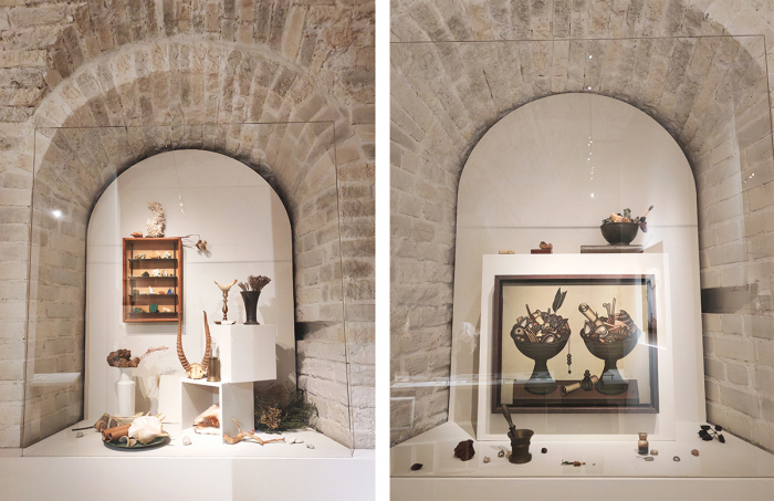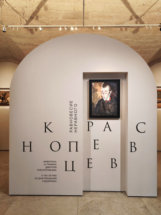 Маршрут построен так, что вы из гардероба проходите в ближайший зал с «азбукой Краснопевцева», где можно узнать о художнике, полистать его дневники, посмотреть архивные документы, фотографии, эскизы, послушать Бориса Перцеля, читающего тексты художника. В нишах расположились композиции с артефактами: собраны камни, раковины, керамика, книги, сухие растения, причудливые ветки и корни, черепа и разные предметы, многие ставшие составляющими «Метафизических натюрмортов».
