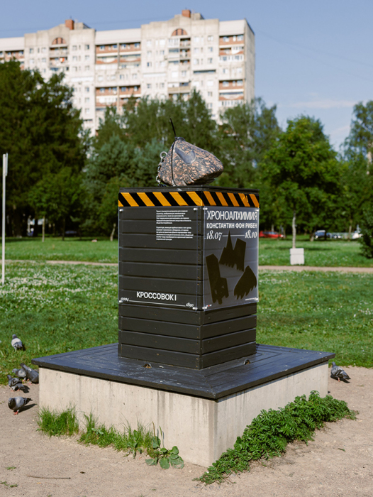 Автор работ — Константин фон Рибен, резидент галереи Marina Gisich Gallery и исследователь формы, памяти и времени. Его шесть скульптурных объектов создают в Саду Бенуа «лабораторию времени», где кроссовки из мрамора, гранитный стул и античный бюст в балаклаве становятся метафорами эпохи.