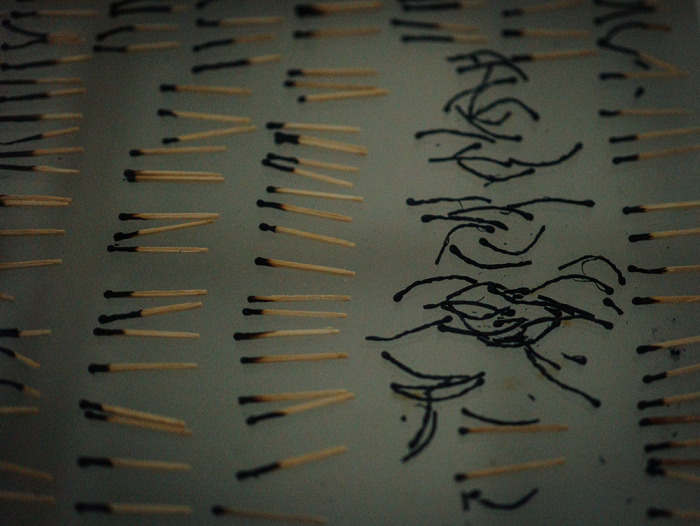 Здесь же представлены сотни сгоревших спичек в витринах как материальная партитура хора. Каждая из них — след коллективного перформанса, в котором участвовали художники и монтажники, зажигая одну за другой.