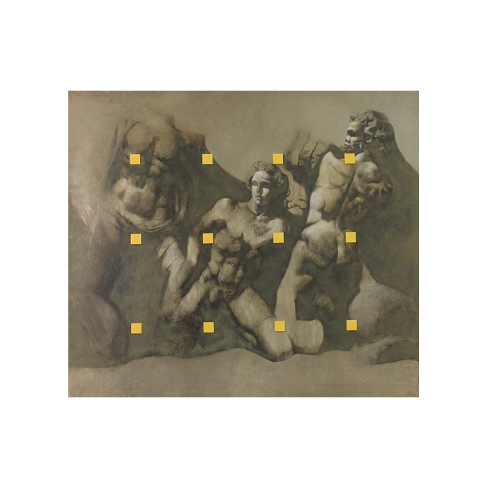 Введение в контекст цветной кафельной плитки, наклеенной на холст поверх изображения, меняет мифологическую матрицу сюжетов. Ярко-жёлтые глянцевые квадраты функционируют и как декоративные репперные точки, отсылающие к пиксельным технологиям, и как напоминание о камне/стене — среде бытования барельефа и его мифологических персонажей. Их барельефная жизнь может быть отчасти замурована, отчасти приоткрыта.