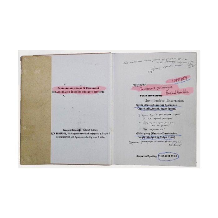 Харьковская группа «Шило» показывает фундаментальный, созданный в течение нескольких лет, фотографический труд под названием «Оконченная диссертация». Его особенность в том, что это, собственно, две книги. Само название указывает на породившего этот ясный жест. Борис Михайлов - монумент харьковской школы фотографии. Когда-то он оформил недописанную диссертацию своего родственника фотографиями и создал «Неоконченную диссертацию». На нее и поклон. Михайлов настолько мощная фигура, что в прямом смысле задает тон всему направлению харьковской фотографии. Участники группы Владислав Краснощёк, Сергей Лебединский и Вадим Трикоз решили бросить ему перчатку. Их работы - своеобразный оммаж Борису Михайлову, отсыл к его самым запоминающимся сериям. Многие снимки авторов еще и «отфактурены», будто их успело коснуться время. Печать ручная, оригинальные фотографии и, как когда-то, недигитальнное фото. Что сегодня уже кажется настоящим искусством, ведь сам процесс предполагает множество знаний, в том числе особенностей бумаги, на которой это должно печататься. Признаться, стилизация под произведения Михайлова настолько сильна, что вполне кажется работами самого маэстро. Это возможно лишь в случае виртуозного владения техникой фотографии и, конечно же, тонкого вкуса, который делает подражание поистине произведением искусства. Но сегодня авторы используют стилистику Михайлова как ключ к любым темам, в том числе политическим. Они вводят в персонажи своих историй, например, Тимошенко, как уже состоявшийся образ. И это, увы, не ирония. Пластмассовый типаж проникает в мозг в качестве супер-героя, стремящегося поработить нас своими гимнастическими эскападами. Заметим, что и Борис Михайлов как-то запечатлел себя в стиле ню, но без политического бэкграунда. Из особенностей «Оконченной диссертации» обратим внимание и на различные карандашные дописки, возникающие на полях как будто картонных фонов, а то и цветные, поперек снимков. Это словно подготовка к какому-то еще более изощренному проекту, зреющему в недрах группы «Шило».