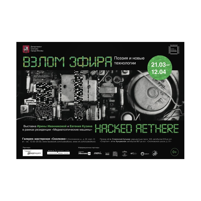 20 марта в 19.00 в галерее-мастерской «Сколково» Объединения «Выставочные залы Москвы» состоится открытие выставки Ирины Иванниковой и Евгения Кузина в рамках резиденции «Медиапоэтические машины»