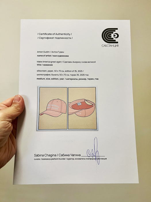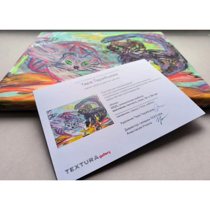 «Сертификат подлинности от галереи необходим для гарантии уникальности и надежности владения конкретной работой, подтверждения ее происхождения и юридической чистоты сделки. В выдаваемом галереей Ruarts физическом сертификате подлинности (сертификат выдается при покупке любой работы, по умолчанию) указаны авторство, наименование, год создания, техника, точные размеры и изображение работы. Это исключает риски подмены или споров о происхождении в будущем. Помимо сертификата подлинности, галерея предоставляет искусствоведческое описание за подписью руководителя научного отдела, в котором раскрывается история произведения: участие в выставках, публикации, а также дается подробная информация об авторе — его биография, регалии и список значимых проектов и выставок. И конечно же чек, подтверждающий факт купли продажи. Эти документы создают полный контекст вокруг объекта, повышая его культурную и исследовательскую ценность и подтверждая статус работы на рынке современного искусства».