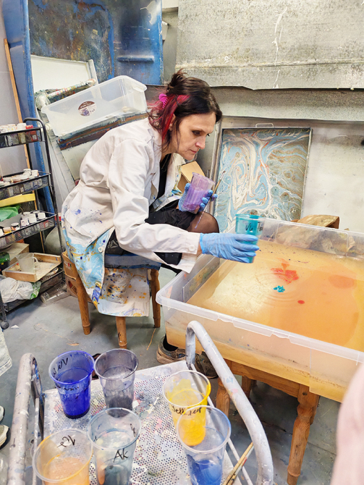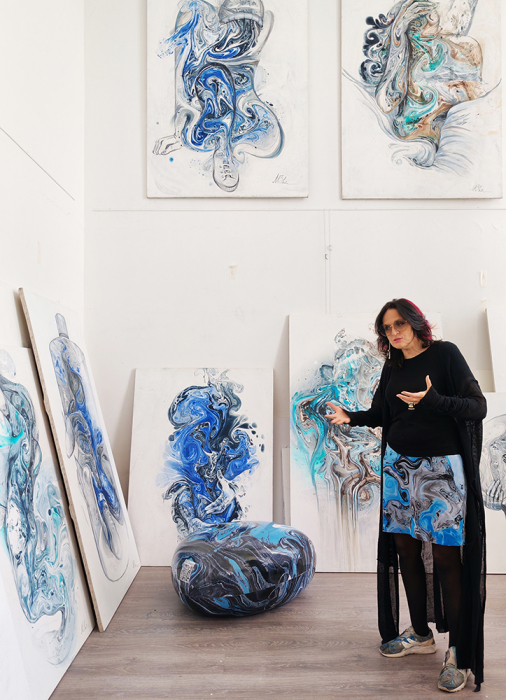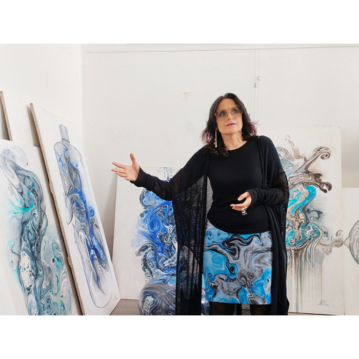 Марина Звягинцева работает в авторской технике «Биотипия» — живопись на движущейся воде. Магия техники заключается в том, что стихия становится соавтором художника и, благодаря течению, каждый опечаток краски становится уникальным произведением искусства.