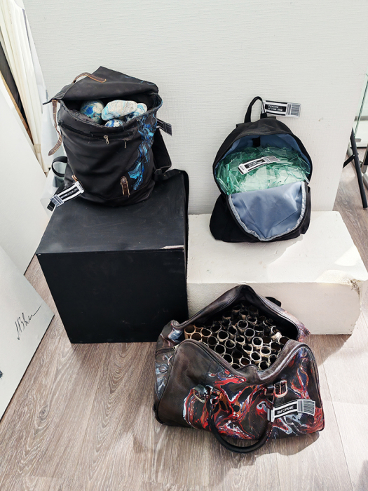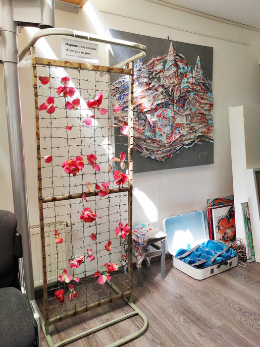 В большой мастерской можно увидеть произведения с самых разных экспозиций: это и живопись, и объекты разнообразных форматов: от цветного камня, умещающегося на ладони, часть арт-акции «Утопи свои печали» до настоящей вертикально поставленной кровати «Постель из роз» из проекта «Спальный район».
