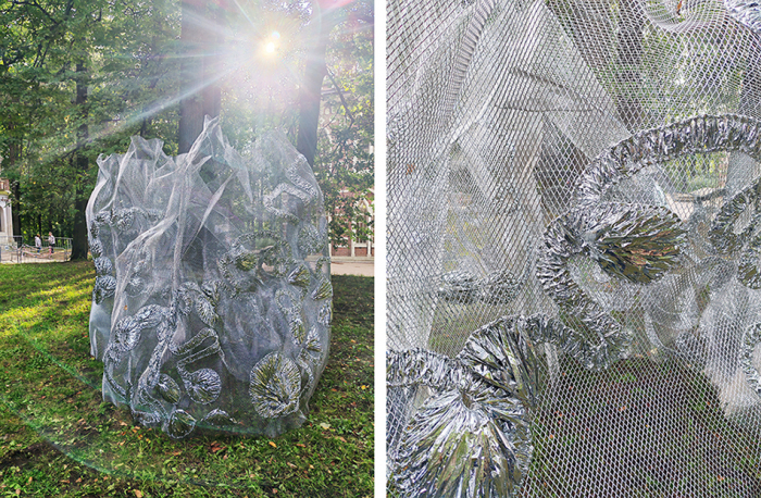 Третий повод для поездки в музей-заповедник «Царицыно» — специальный проект V Триеннале текстильного искусства «Эдем». Его можно увидеть до 10 октября. Это пять арт-объектов, расположенные в разных зонах парка под открытым небом. Произведения созданы на стыке науки, искусства и технологий и изучают разные способы коммуникации деревьев.