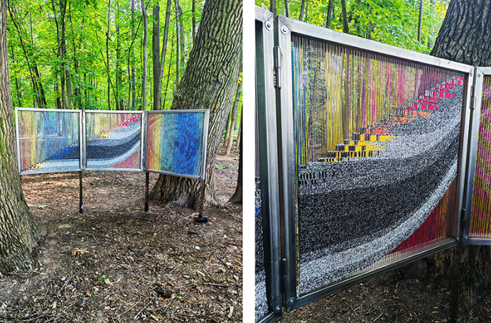 «Партитура дерева» Василия Бычкова в сотрудничестве с Александром Райхельсоном создана на данных научного исследования дуба Святого Людовика, растущего в Национальном лесу Тронсе во Франции. В произведении три части. В первой автор использовал данные окружающей среды у дерева: температуру, наличие осадков и состояние атмосферы в определенный момент времени и визуализировал их в технике ручного ткачества. Вторая часть показывает развитие процесса, а третья часть показывает исследование спила дерева. Местонахождение работы в парке между двумя деревьями также имеет значение и отсылает к Людовику IX и его идее справедливого правосудия. Работа сопровождается музыкальной композицией Александра Райхельсона, созданной с учетом тех же параметров, что использовал Василий Бычков, как другая ипостась данных. Ищите QR-код для прослушивания.