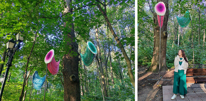 «Нейросеть души. 26 августа 1789-2021-2025» Христины Высоцкой — художественная интерпретация биологической активности дуба из города Герника на севере Испании через форму, цвет и фактуру материалов. Работа расположена рядом с дубом в Царицынском парке, посаженном в 1789 году. Для создания работы использовались данные дуба Герника от 26 августа 2021 года, что связывается с 1789 годом: 26 августа 1789 года во Франции была принята Декларация прав человека и гражданина. Инсталляция состоит из трех текстильных овалов, выполненных в технике ручного плетения ковров, установленных на высоких металлических трубах. Автор отражает в голубом цвете температуру, то есть внешнее воздействие на дерево; в зеленом — внутреннее движение дерева как жизненную силу, а через розовую часть объекта показан рост годовых колец как устойчивость и контакт с землей.