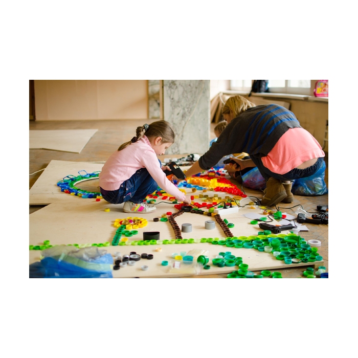 17 апреля участникам ресайкл-лаборатории под руководством индустриального дизайнера Анастасии Малыбаевой предстоит оформить трехметровую маску Совы пластиковыми крышками различного цвета и размера, и тарелками, которые они будут расписывать прямо на месте.