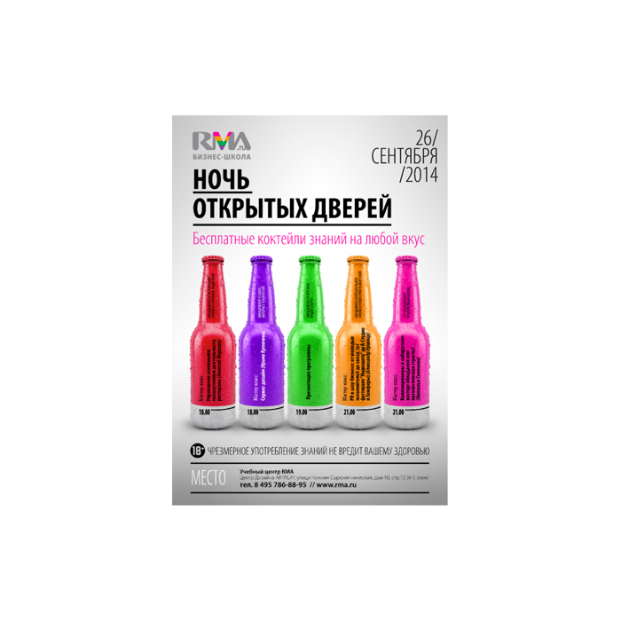 В пятницу 26 сентября в учебном центре бизнес-школы RMA состоится «Ночь открытых дверей», во время которой абитуриентов ждет презентация программ обучения, знакомство с руководителями факультетов и преподавателями, а также мастер-классы и открытые лекции.