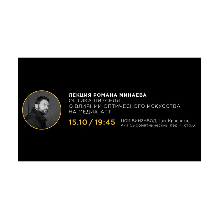 15 октября 2014 г. в 19:45 в Цехе Красного (Центр современного искусства ВИНЗАВОД) в рамках выставки «Оптические пространства Виктора Вазарели» состоится лекция Романа Минаева «Оптика пикселя. О влиянии оптического искусства на медиа-арт».