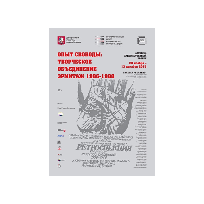 В экспозиции архивно-художественного проекта «Опыт свободы: Творческое объединение Эрмитаж 1986-1988» представлены произведения живописи Николая Филатова, скульптуры Вадима Сидура, фотографии Игоря Пальмина, объекты Игоря Шелковского, инсталляции Ирины Наховой, а также архивные документы и издания из коллекции ГЦСИ, связанные с нонконформистским творчеством отечественных художников, входивших в круг объединения «Эрмитаж» и работавших вне влияния официальной идеологии конца советского периода.
