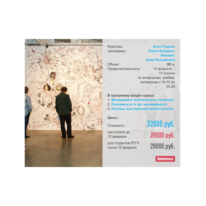 Основы выставочной деятельности (28 часов) 19 февраля – 2 апреля, занятия по четвергам, с 19.10 до 22.20. Анна Познанская.