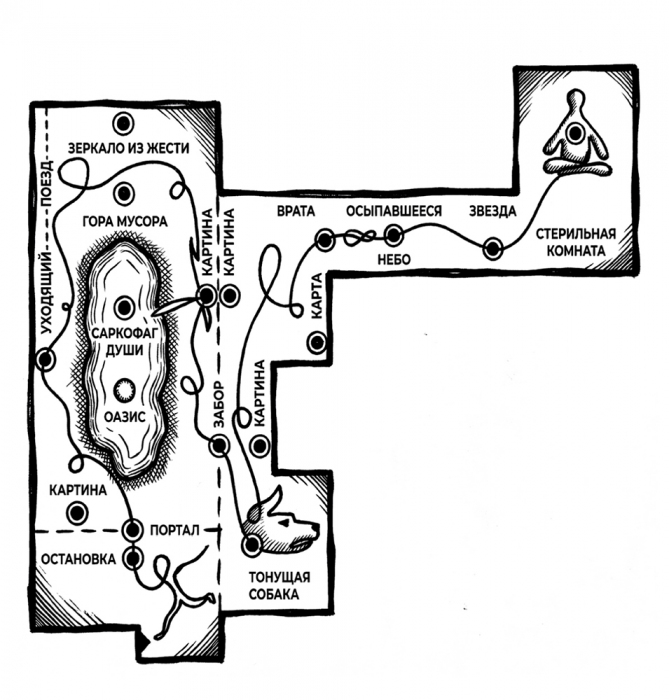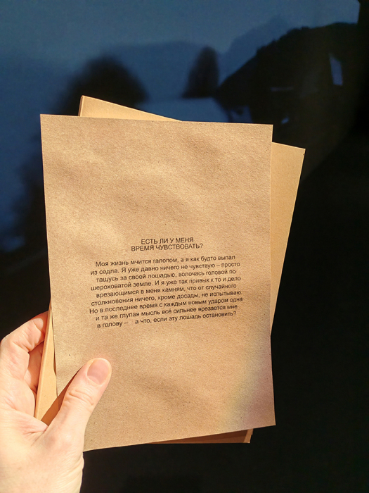 На входе в пространство посетители берут папку-дневник, которую в процессе путешествия по выставке-спектаклю можно наполнить своими смыслами или вариантами, предложенными создателями.