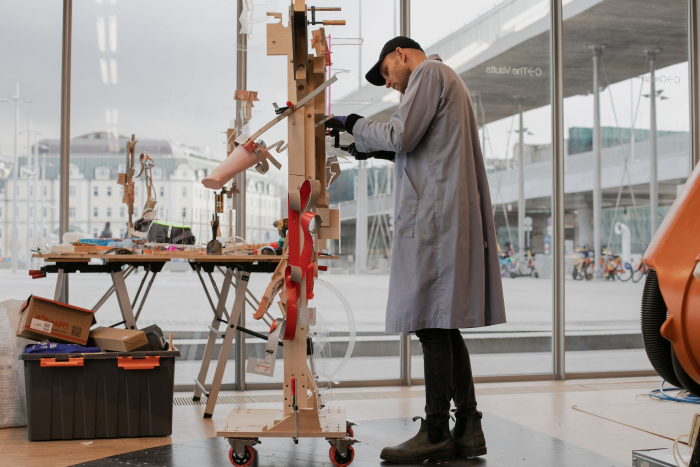 Или, например, Евгений Климин: он работает со звуком. Вообще, он преподаватель сольфеджио, тема его кандидатской диссертации «Исторический звукоидеал русских колоколов XVI — начала XX веков». У нас он сделал музыкальный инструмент из своего разбитого автомобиля, проект называется «Ласточка».