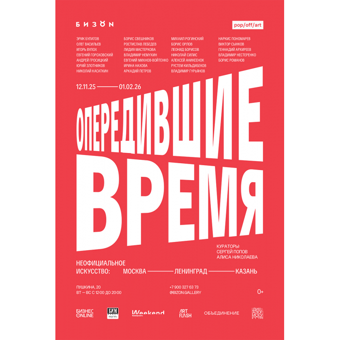 12 декабря в галерее БИЗОN совместно с галереей pop/off/art откроется выставка «Опередившие время» под кураторством Сергея Попова и Алисы Николаевой. Она объединит работы художников неофициального искусства 1950-1980 гг., работавших в трех крупных культурных центрах: Москве, Ленинграде, Казани.