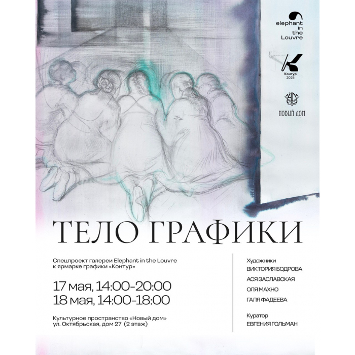 Московская галерея Elephant in the Louvre с 16 по 18 мая 2025 года в рамках параллельной программы ярмарки графики «Контур» в Нижнем Новгороде представит групповую выставку «Тело графики». Проект предлагает взглянуть на графическое искусство как на материальную практику, раскрывающуюся через телесность художника, особенности медиума и личный опыт зрителя. В пространстве культурного центра «Новый дом» будут показаны работы — Виктории Бодровой, Аси Заславской, Оли Махно и Гали Фадеевой. Куратором выставки выступила кандидат социологических наук, выпускница MSCA Евгения Гольман.