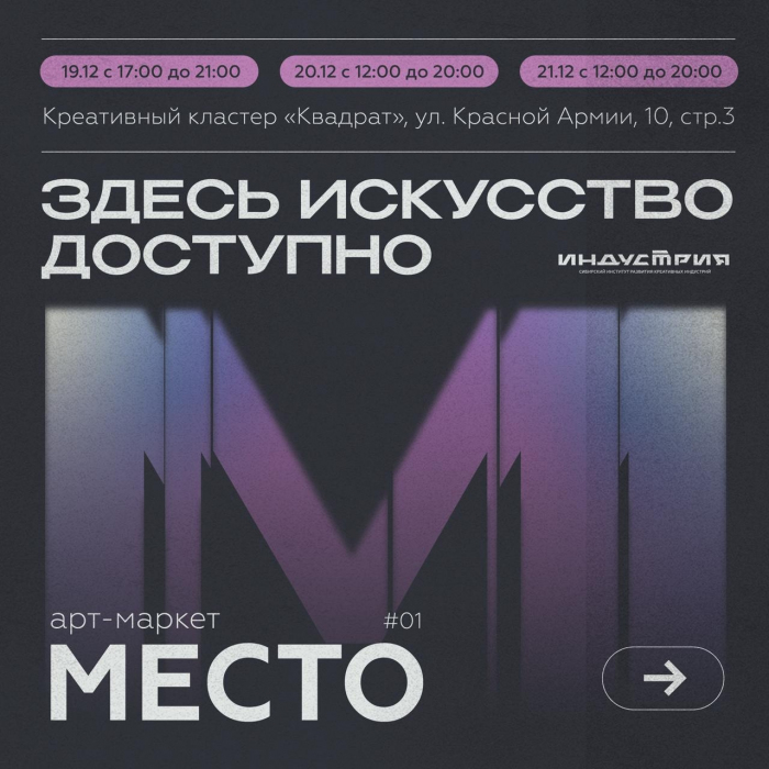 В креативном кластере «Квадрат» пройдет первый арт-маркет «Место», на котором можно будет познакомиться с творчеством современных художников Красноярска и других городов России и приобрести представленные работы. Формат арт-маркета, в отличие от уже известных красноярцам ярмарок современного искусства, предполагает более доступные цены и дополнительный ассортимент: постеры, открытки, стикеры, сувениры.