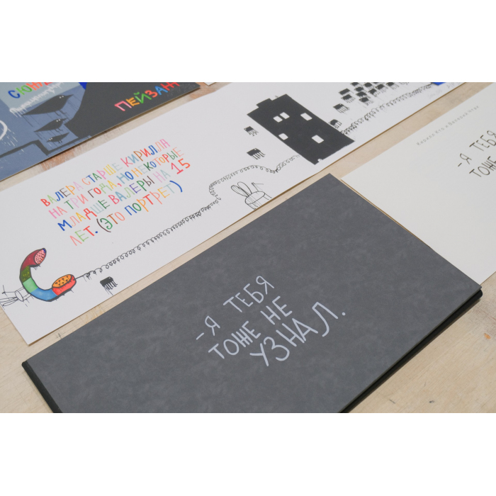 Никита Алексеев, изначально разлагая текст до его кванта — буквы, синтезирует текстовые сообщения, смешивая понятия и визуальные обозначения в узнаваемой форме азбуки. Альбомная форма располагает к парципаторной практике, что предоставляет зрителю поле для игры в угадывание и достраивание смыслов. Никон Филиппов ссылается на гуманистический текст Эразма Роттердамского, конструируя современную эсхатологию. В поле одного листа он коллажирует собственную мифологию и нравоучительный канон. Никон выступает как ученик к которому обращантся Эразм, но использует канву текста для собственных графических комментариев. Валерий Чтак и Кирилл Кто работают как антенны — улавливают обрывки внешней коммуникации и преобразуют их в текст. Альбом стал средоточием и архивом узнаваемых стилей обоих авторов в контексте одного события — совместной выставки.