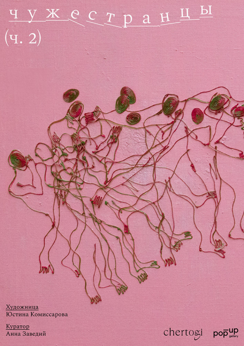 Путешествующая галерея Кати Поповой представляет двухчастную персональную выставку Юстины Комиссаровой под кураторством Анны Заведий. Через инсталляцию, живопись, графику, объекты, видео-арт и музыку композитора Константина Чистякова, автор исследует состояние человека в мире, где ощущение устойчивости и принадлежности постоянно подвергается испытанию. Первая часть выставки была представлена в пространстве Hovard Club, как некая инсталляционная среда, в которую зритель входил как в особое поле присутствия. Вторая часть проекта интегрирована в пространство иммерсивной студии дизайна Chertogi. Художница покажет новую серию живописи, где фигуры обретают цвет, плотность и телесность. Если первая часть построена вокруг наблюдения и дистанции, то вторая развивает тему сближения и взаимодействия между людьми. Название выставки отсылает к фигуре «чужестранца» — не только как к образу другого человека, но и как к состоянию современного человека в целом. Персонажи в работах Комиссаровой находятся в постоянном движении, словно в поиске опоры и возможности взаимного узнавания.