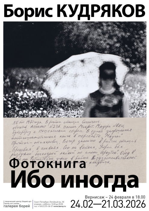 Фотокнига «Ибо иногда» (2004) состоит из 14 листов картона (60х50) различного цвета, на них размещены 24 фотографии, датированные с 1957 по 1977 год, три рисунка цветными фломастерами, пять рассказов и два стихотворение из книги «Лихая жуть» («Борей-Арт», 2003), напечатанные на белой бумаге, и множество рукописных текстов шариковой ручкой и карандашом, комментирующих фотографии и рисунки. Фотокнига «Ибо иногда» вполне может быть отнесена к жанру книга художника, она полностью сделана вручную и в единственном экземпляре, но предназначена для экспонирования в выставочном пространстве. По технике изготовления она представляет собой коллаж, где в качестве материалов используются фотографии, рисунки, печатные и рукописные тексты, по стилистике оформления книга напоминает стенгазеты, которые в советское время были чрезвычайно популярны и изготовлялись повсеместно – от школ и вузов до промышленных предприятий и музеев. В содержательном отношении книга «Ибо иногда» построена на сплошных диссонансах, разноголосице, дисгармонии. Фотографии и рисунки не иллюстрирует тексты, а тексты находятся в вопиющем противоречии с визуальной реальностью. Борис Кудряков (1946 - 2005) по праву считается родоначальником послесталинской независимой фотографии в Ленинграде. Он реанимировал линию петербургского архетипа, идущую от Гоголя, Достоевского, Вагинова, Добужинского, Шиллинговского. В своем фотографическом творчестве он был последовательным антиэстетом. Дополнительная информация про автора в статье по ссылке.