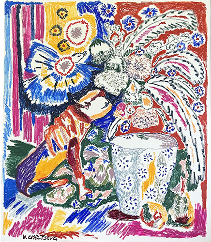В центре выставки образ букета как точка встречи эмоций, личной истории и традиций. От античных фресок до модернистских натюрмортов цветочные композиции отражали подвижный срез времени — момент расцвета или упадка. Изображение пышных цветов символизировало радость, веру, рост и силу, в то время как опавшие листья напоминали о мимолетности красоты и неизбежности увядания. В повседневности букет остается атрибутом поворотного события, объединяющий людей в коллективном переживании торжества и траура. В творчестве Вари Чельцовой букет становится порталом в мир чувств, переживание которых рождает надежду на будущее. Обращаясь к языку модернистской живописи, художница работает с цветовыми полями, яркой палитрой и орнаментальными композициями. Созданная в период миграции и личных утрат, эта серия — возможность для автора открыто делиться любовью, радостью и красотой именно так, как учат нас самые близкие люди. В каждом холсте зритель найдет символические послания — интерьеры Тель-авива, скульптуры из тарусского дома, керамику сестры, мамины утренние цветы, детские игры на лестнице, встречи за столом и другие семейные воспоминания.