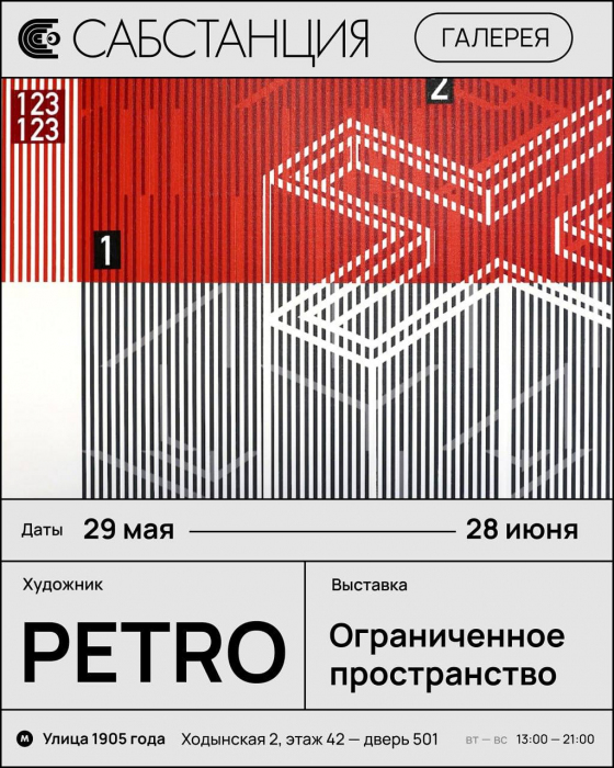 Адрес: Москва, ул. Ходынская, д. 2, ЖК Пресня-сити, Зотов, Западная башня, этаж 42, офис 501, на стойке ресепшн вызовут лифт, но в случае чего — пишите/звоните в ТГ @substation_info или по номеру:+79254254242. График работы: с 13:00 до 21:00, ежедневно, кроме понедельника. Стоимость билета — 300 рублей. Вход в галерею по предварительной регистрации. 18+