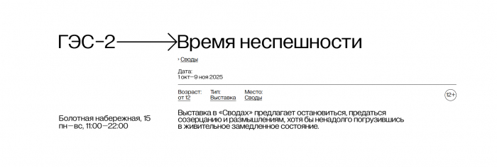 Выставка предлагает остановиться, предаться созерцанию и размышлениям, хотя бы ненадолго погрузившись в живительное замедленное состояние. Темы проектов связаны с самой природой и процессом размышлений: что их питает, что захватывает мысли быстро, а что — замедляет. Екатерина Герасименко сосредоточивает взгляд на деталях и бытовых предметах, которые обычно не привлекают внимания. Фокус на повседневном характерен и для серии фотографий «Не-место» Лены Соловьевой, которая буквально создает портреты скромных вещей — строительных материалов и инвентаря. У Анны Бёрч героями стали невыразительные фасады высотных зданий — безликие, монотонные, вневременные. Еще одна общая для авторов тема — воспоминания и память. С одной стороны, это как путешествие во времени, поворот к прошлому. С другой стороны, воспоминания требуют остановки бега, замедления. Художники: Оксана Афанасьева, Никита Баранов, Анна Бёрч, Илья Буслаков, Екатерина Герасименко, Павел Гришин, Егор Заика, Александра Замуруева, Евгений Климин, Артем Ляпин, Любовь Ремизова, Лена Соловьева, Кристина Сырчикова, Мария Тимофеева, Даниил Толкалин.
