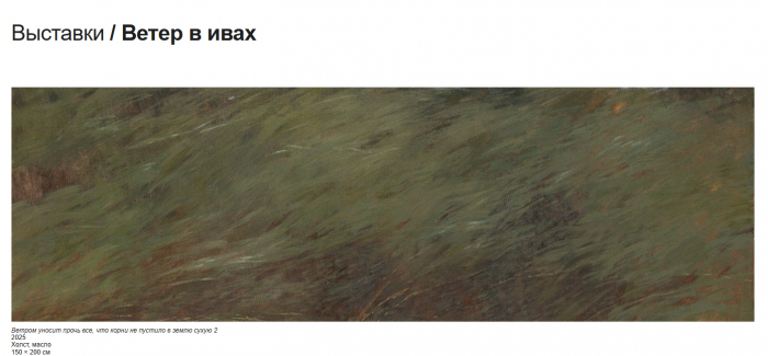 В экспозицию вошли живопись на холсте и дереве, а также звуковая инсталляция. Отталкиваясь от практик, связанных с «лесными ваннами» и поиском гармонии в природе, Дёмина предлагает иной вектор: бушующий ветер становится метафорой внутренней турбулентности. Живописная практика художницы строится на поиске тончайших оттенков и создании цельного цветового пространства. Постепенное совершенствование работы с цветом превратилось в серию произведений — от камерных до крупных составных полотен. Визуальная доминанта экспозиции — масштабное полотно «Ветром уносит прочь всё, что корни не пустило в землю сухую», — задает ей ритм и масштаб. Экспозиция выстроена с чередованием горизонтальных линий пейзажа и вертикалей, уходящих ввысь безликих пространств. «Ветер в ивах» превращает пейзаж в пространство переживания и приглашает зрителя к внимательному вглядыванию в детали, где полутона цвета перекликаются с внутренними состояниями. Звуковая инсталляция усиливает восприятие, меняя интенсивность от завывания к затуханию.