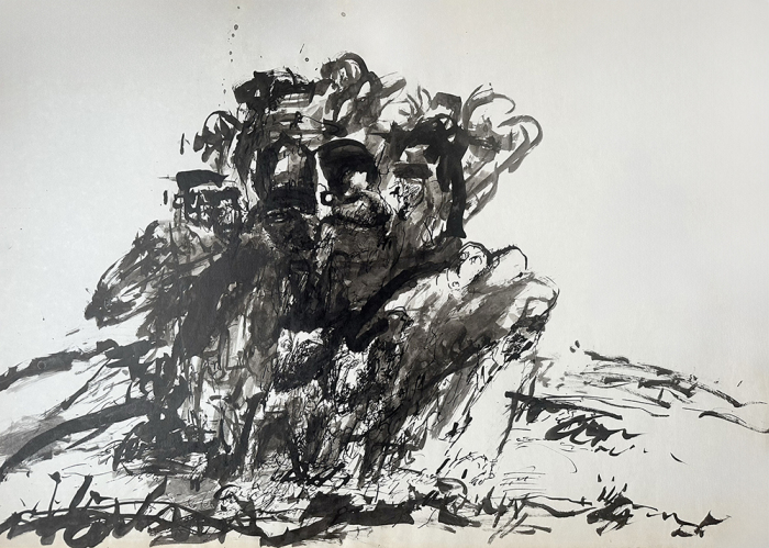 В центре выставки — книга художника из ста чёрно-белых страниц, которую можно листать в обе стороны. У неё нет привычного начала и логического финала: вход в последовательность возможен с любой страницы. Здесь время — не сюжет и не иллюстрация к событию, а движение руки по краю блока, кадр-за-кадром, как в немом кино или флипбуке: то ускоренная перемотка, то медленное разглядывание одного листа. Абстрактные композиции напоминают живопись, находящуюся между письмом и рисунком. Жесты художника перекликаются с практиками Сая Твомбли и автоматического письма сюрреалистов: линия выглядит как запись, но не подчиняется языку. Там, где мы привыкли искать слово, мы сталкиваемся со следами движений, которые не складываются в читаемую фразу, но создают ритм, дыхание, эмоциональную «температуру» книги. Это не иллюстрация к философской идее и не рассказ о борьбе противоположностей, а предложение посмотреть, что происходит, когда каноническая форма книги перестаёт диктовать, что и как нужно читать. В момент, когда зритель закрывает книгу и решает, с какой стороны начать в следующий раз, проект достигает своей цели: договор между книгой и читателем приходится заключать заново.