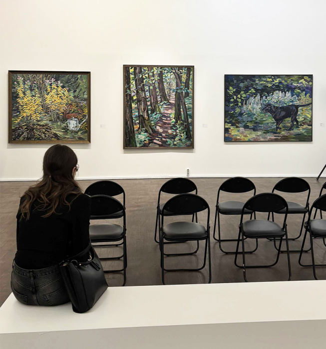 В экспозиции много света и пространства. Залы позволяют разглядеть крупноформатные полотна с расстояния, как и задумано. Рядом с масштабными пейзажами соседствуют камерные интерьеры.