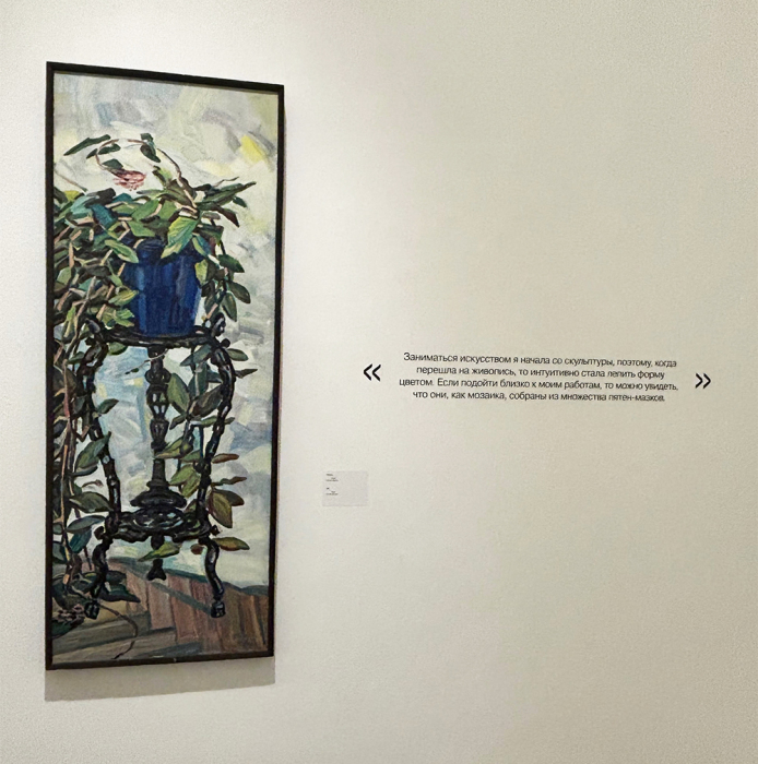 Ее художественный мир — это тихие уголки Подмосковья, цветочные композиции в интерьерах, аллегорические композиции, отсылающие к Серебряному веку и мимолетные состояния природы.