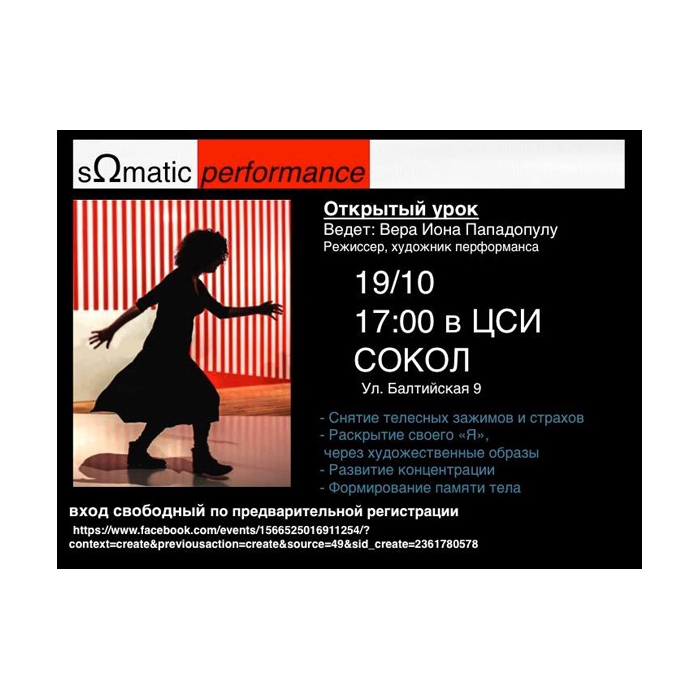 19 октября в ЦСИ СОКОЛ Вера Иона Пападопулу проведет открытый урок по sΩmatic performance.