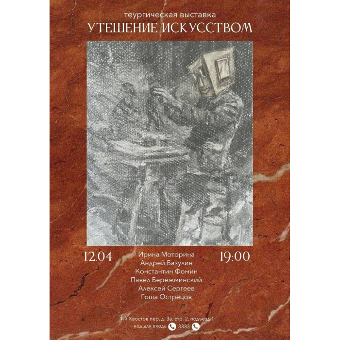 На Пасху открылась выставка «Утешение искусством» в мастерской художника Гоши Острецова. Это выставка сообщества художников, для которых философия — стала неотъемлемой частью творческого процесса. Их дискуссии о великих текстах (в том числе — «Утешении философией» Боэция, философская теология Ямвлиха Халкидского и др.) рождают художественные ассоциации и образы. Название выставки — тонкая отсылка к традиции философских размышлений. Среди участников — люди самых разных профессий: химик, учитель истории, математик, архитектор и, разумеется – они художники, объединенные страстью к философии.