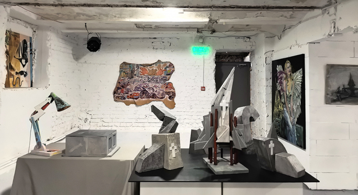 Серия работ Константина Фомина «МЕХАНИЗМЫ — ex machina» выстраивает диалог с андеграундным макетом с противоположной стены своими холодными, механическими и архитектурными формами. Это рассказ о скрытом потустороннем мире, возможно тоже подземном, наполненом брутальными механизмами, которые незаметно, но четко держат мир в равновесии, тихо управляя всеми процессами. Фомин направляет луч внимания в темноту, на мгновение обнажая фрагменты скрытых управляющих структур — будто приоткрывая завесу над тайной.
