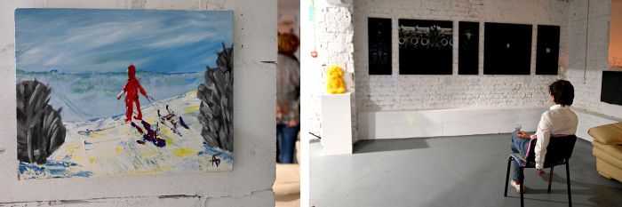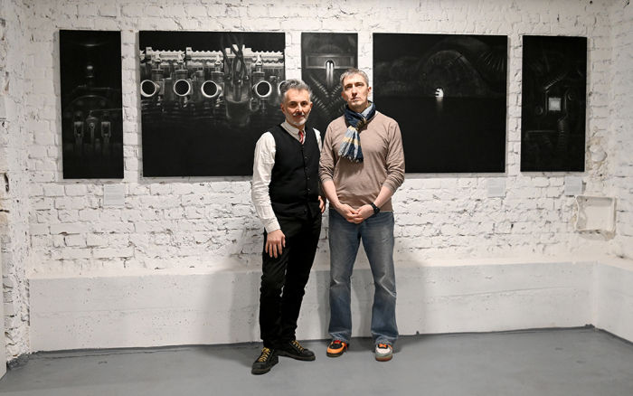 Серия работ Константина Фомина «МЕХАНИЗМЫ — ex machina». На фотографии Гоша Острецов — куратор выставки и Константин Фомин
