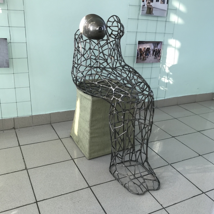 Работа Елены Алексенко "interACTION" олицетворяет взаимодействие человечества с современными глобальными проблемами, где клетка символизирует борьбу за жизнь в условиях агрессивной внешней среды — от коронавируса до массированных инфопотоков.