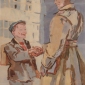 Александр Лабас – поэт индустриального мира, для которого аэропланы, дирижабли, скоростные поезда были чудом ХХ века. Он – один из учредителей и самых ярких художников группировки ОСТ середины 1920-х годов. Во время войны Лабас написал цикл «Москва и Подмосковье в дни войны». Его акварели столь же прозрачны и полны воздуха, как и знаменитые живописные полотна. Художник изображает повседневную жизнь людей во время войны, их трудовые и боевые будни. И в каждой работе, наполненной болью, мы видим жизнь, которая продолжается вопреки трагическим обстоятельствам.