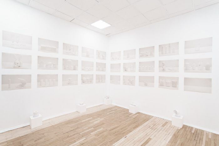 В белом зале, серия фотографий с условным обозначением «Белое на белом» - это работа Эдика. Рефлексия по поводу Вейсберга, Моранди, прочих «глубокомысленных» художников. По поводу всякой духовности и метафизики, представлениями о них, над которыми мы стебёмся. Вся выставка была посвящена таким «эзотерическим» явлениям в русском искусстве. Их было много, все не поместились. Череп с заячьими ушами, белые кактусы, Пушкин с канализационной трубой, пластиковые стаканчики, гипсовые детали. Некоторые из этих объектов были выставлены в галерее на белых кубах-постаментах, и они вращались на специальных подставках – рулон туалетной бумаги, белые тапочки, череп, пачка сахара, изогнутая труба.