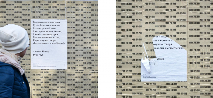 Авдей Тер-Оганьян: Это отличный пример стрит-арта средствами графического дизайна. Концептуализм в уличном плакате. Очень тонкая, эстетская и глубокая работа. Предельно минималистичная. Серые плакаты, криво, неровно, с морщинами наклеенные на кирпичную белую стену, супер-эстетика получается.