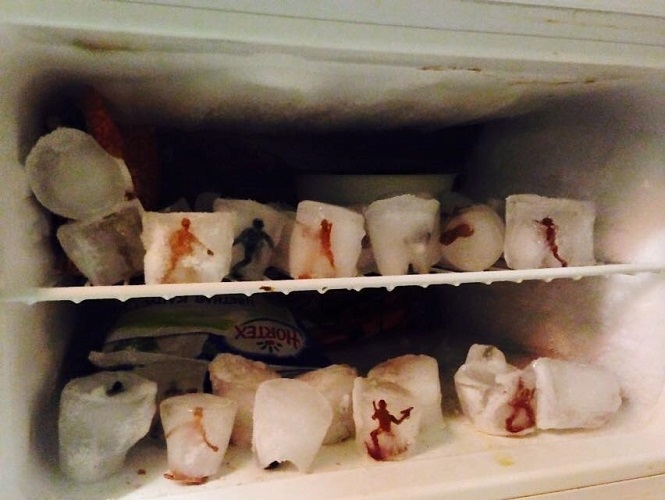 Екатерина Исаева в морозильной камере выставила кубики льда, в которых застыли пластиковые солдатики. Эта работа называлась «Война. Заморозка». В современной ситуации работа может интерпретироваться однозначно: «Peace. No war». Проступающие через мутный лед очертания пластмассовых человечков, напоминают какой-то инфернальный театр теней.