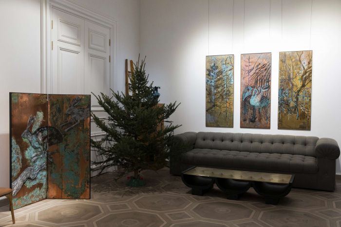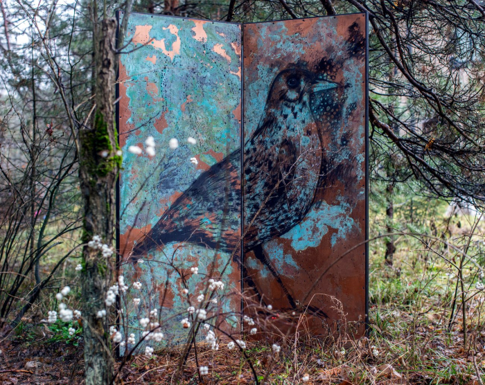 То, что некоторые работы из серии лес имеют формат ширмы также можно трактовать как символическую попытку вернуться в состояние детства — бытовой предмет, чья задача закрывать человека от постороннего взгляда, сегодня вновь встает как хрупкая, но надежная стена между внутренним миром, безопасным пространством собственного жилища и холодной внешней реальностью.