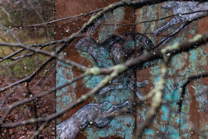 Неслучайно лес стал источником вдохновения для новой серии работ Екатерины Рожковой — графических панелей на листах меди и латуни. Металлическая основа этих произведений выступает метафорой отражающей поверхности, в которую зритель заглядывает для того, чтобы лучше узнать себя. И для художника, и для внешнего наблюдателя искусство становится инструментом самопознания. Но что же подходящий к зеркалу видит в нем? Отполированная поверхность покрыта пятнами окиси и царапинами, так что в нем уже нельзя разглядеть собственного лица — это патина, которую время оставляет на человеческом сознании, со временем она покрывает всю плоскость окна в мир, так что человек уже не видит ничего, кроме следов опыта, рутины и серых будней.