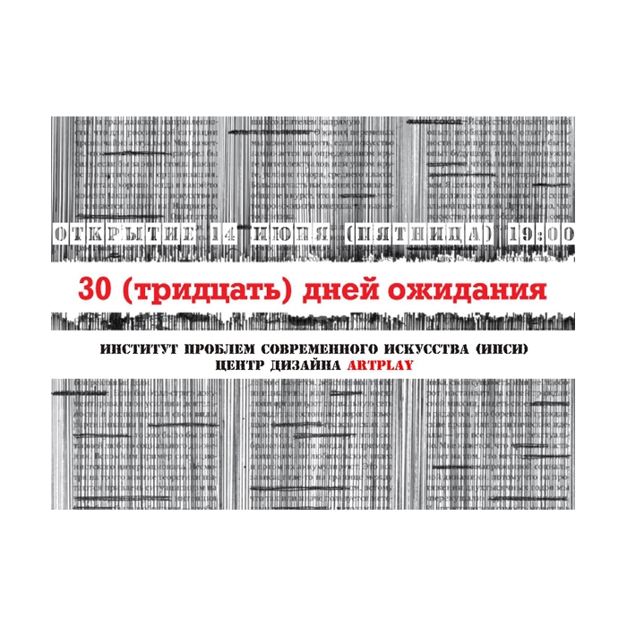 «30 дней ожидания» - это проект, движущей силой которого было любопытство: могут ли тридцать человек в течение тридцати дней прийти к общему мнению и разработать идею, объединяющую такую большую группу молодых художников. Принципиальной позицией стало то, что кураторы изначально не объявляли тему и принимали участие в дискуссиях наравне со всеми. По окончании срока каждый из участников предоставил работу для выставки, выражающую его собственный результат и опыт, полученный в ходе совместных дискуссий.